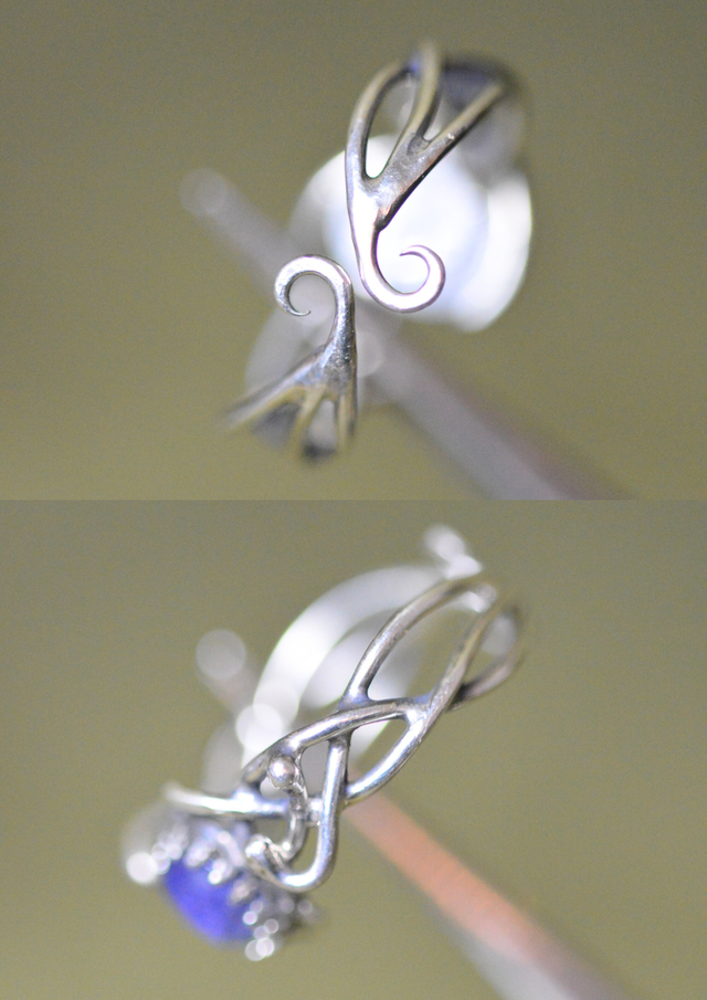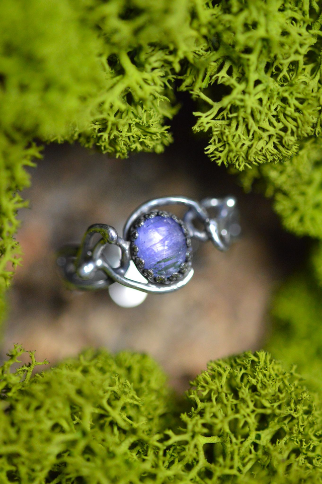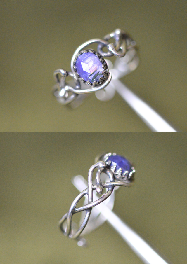Elle est sertie d'une belle Tanzanite, et ornée d'arabesques de fils.