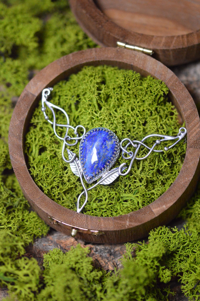 Il est serti d'une Lapis lazuli aux nuances intenses, et il orné de feuilles simples.