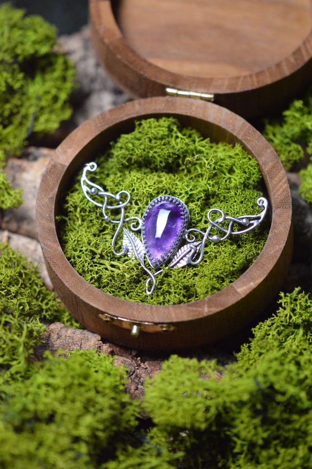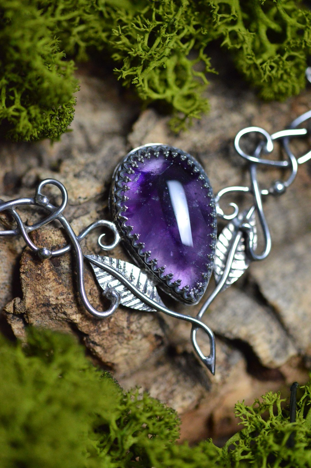 Il est serti d'une Améthyste au violet intense, et il orné de feuilles simples.