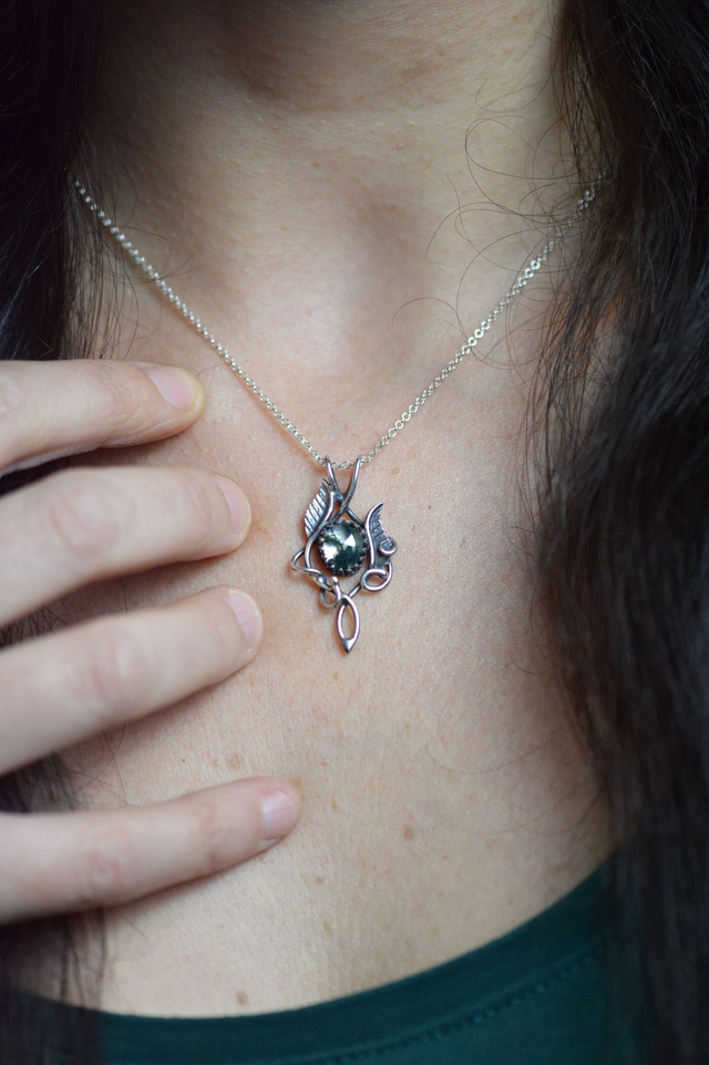Pendentif aux inspirations elfiques forgé dans le feu et travaillé entièrement à la main en argent 950 .